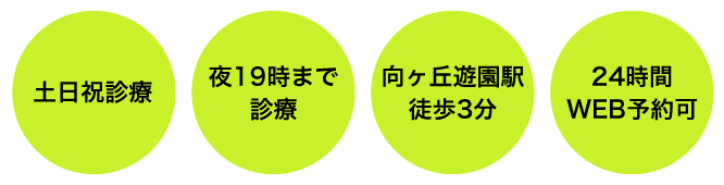 小田急線「向ヶ丘遊園駅」南口から徒歩3分とアクセス抜群の歯科医院です。お仕事や学校などでお忙しい方も通いやすいよう、土日・祝日も19時まで診療を行っており、WEBからは24時間いつでもご予約を承っております。英語対応も可能ですので、外国籍の患者さまもお気軽にご来院ください。